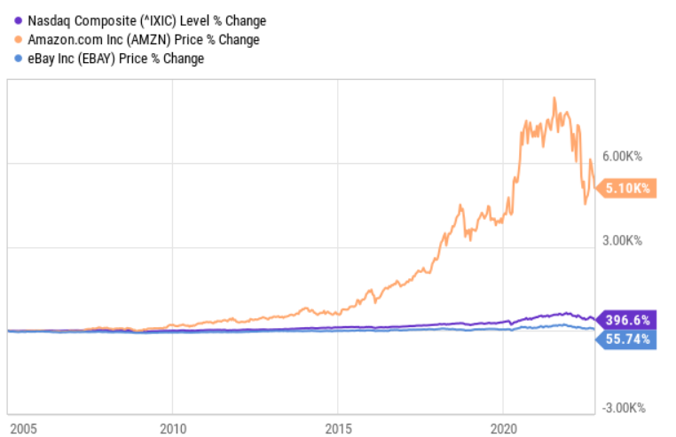 Now, look at the return from January 2005. The light blue stock was $EBAY, the orange $AMZN and the dark blue #NASDAQ