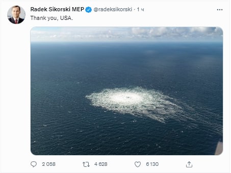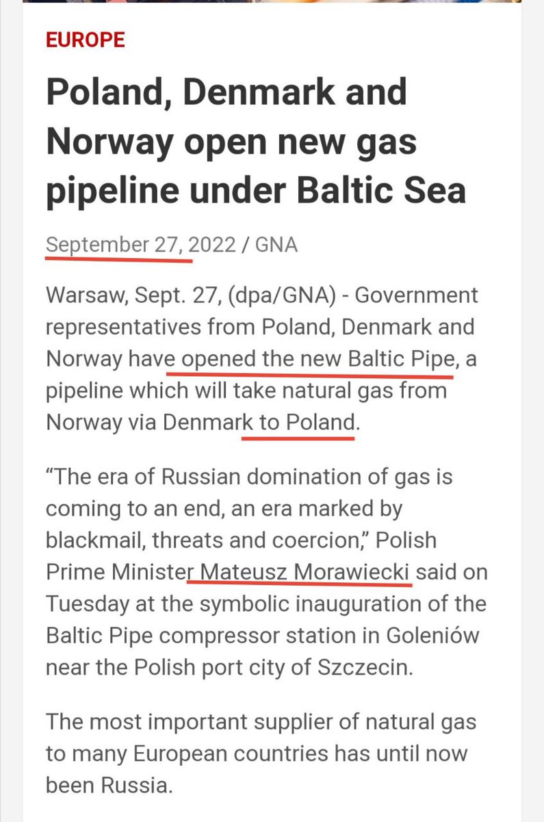 El ataque también tiene un componente simbólico: El mismo día que se habilita un gasoducto de Noruega a Polonia, se destruyen las líneas Nordstream. [En foto, político polaco: “Gracias USA”] 🧵6