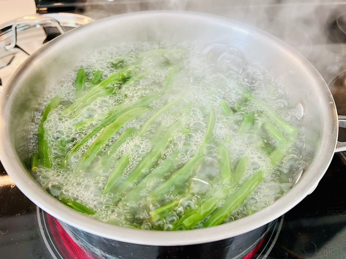 Pra vc acertar o ponto da vagem e preservar uma textura nela, recomendo branquear ela primeiro. Esse processo vai preservar a textura ideal e a cor também. É uma fervura seguida de choque em água gelada que vc pode deixar pronto muito antes de servir.