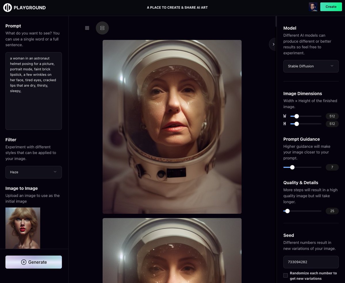 But once I added this AI generated version of Taylor Swift (bottom left) and modified the prompt a bit, I can create even an older version of the astronaut.
