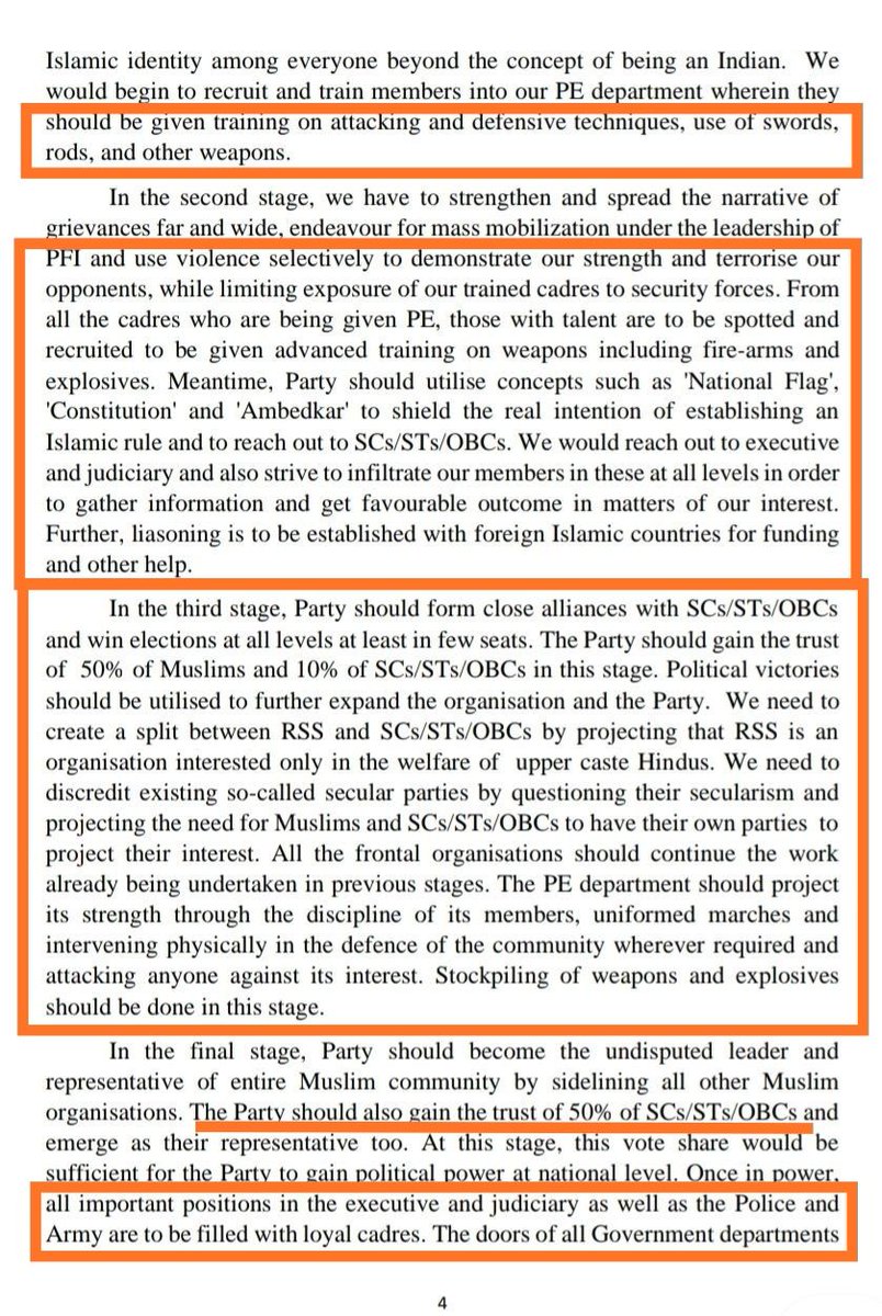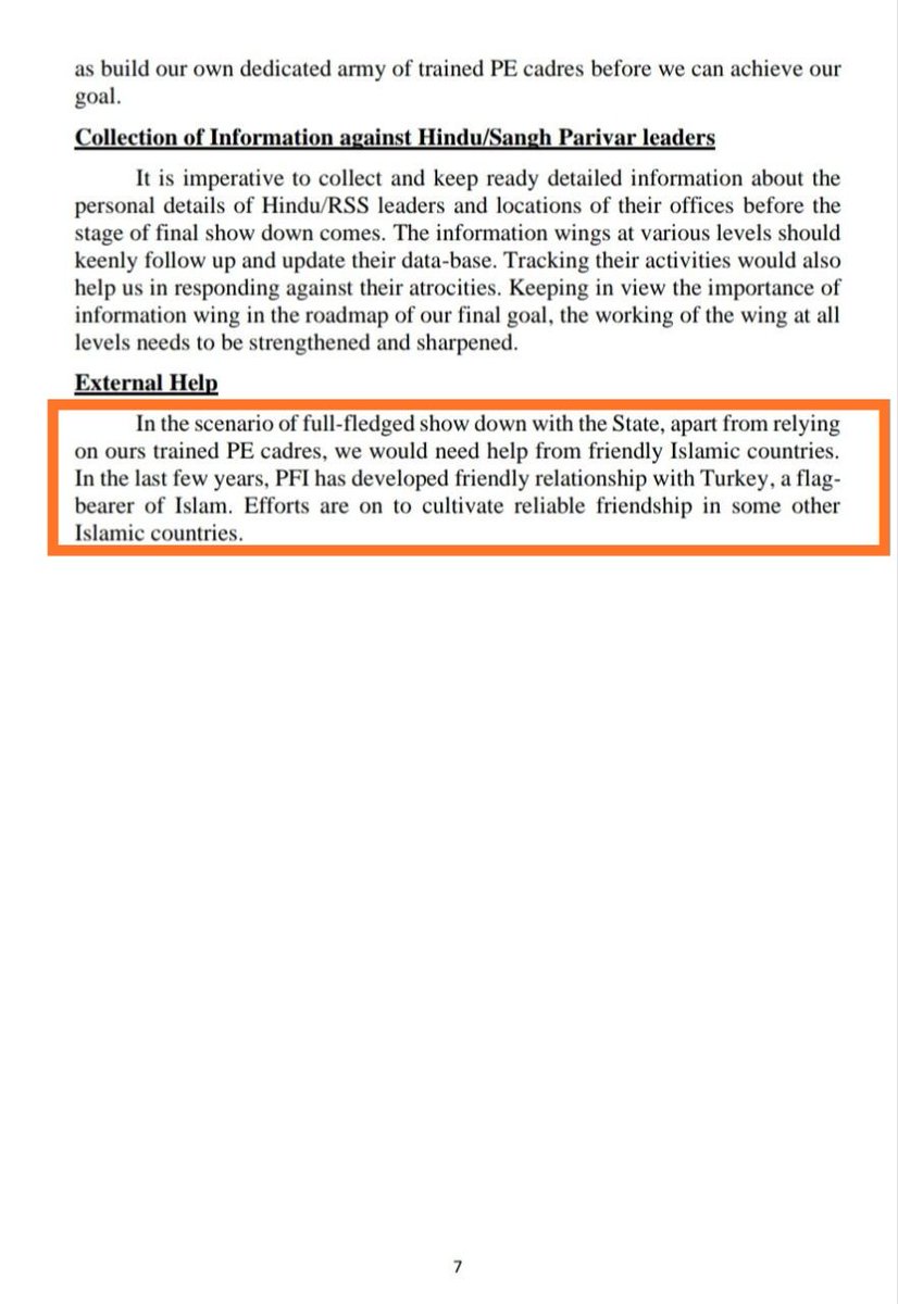 या जागांची माहिती केवळ ठराविक लोकांनाच असेल याची काळजी घ्यावी. मदत लागल्यास आपल्याला बाहेरील इस्लामिक देशांकडून मदत घ्यावी लागेल. सध्या तुर्की सोबत पी.एफ.आय चे मैत्रीपूर्ण संबंध निर्माण झालेले आहेत, अजून काही इस्लामिक देशांसोबत सुद्धा नक्की होतील' 15/17