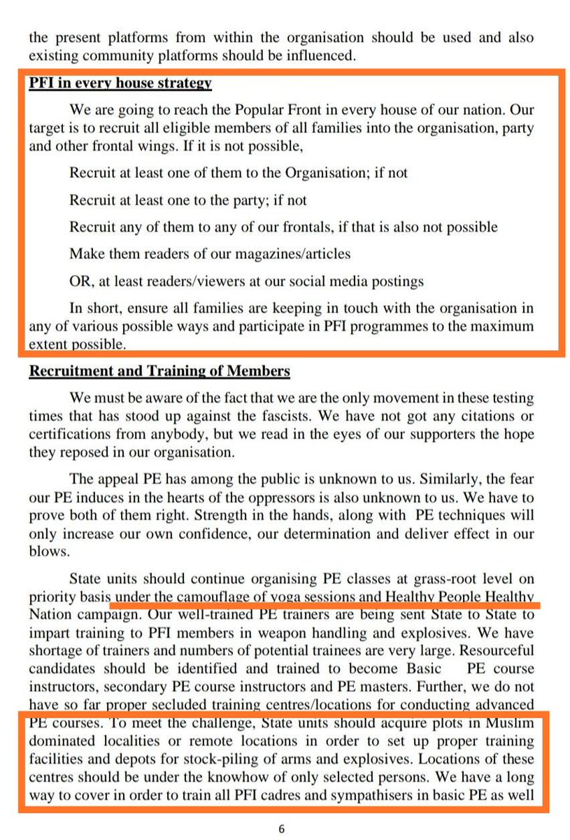 'योग आणि इतर अश्या अभियाने घेऊन, लोकांना एकत्र आणून पी.एफ.आय. च्या अंतर्गत त्यांना वेपन्स ट्रेनिंग देणे हा एक उद्देश आहे. असे करण्यासाठी मुस्लिम बहुल भागांमध्ये प्लॉट विकत घेऊन त्या जागांवर अश्या पद्धतीची ट्रेनिंग देण्यात यावी. 14/17