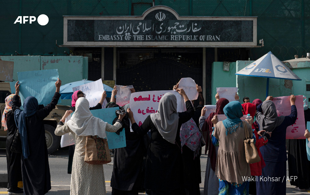 About 25 Afghan women protested in front of Kabul's Iranian embassy before being dispersed by Taliban forces firing in the air, an AFP correspondent reported.
