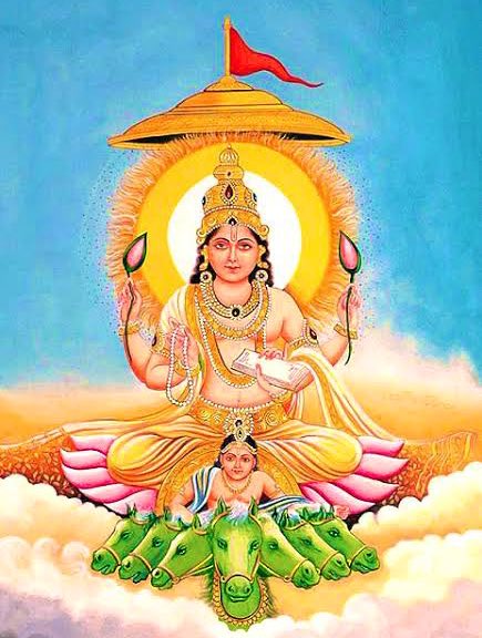 According to legends earlier this world was without light. At that time Brahma ji appeared. The first word that came out of his mouth was ॐ, a subtle form of the Sun. Thereafter, four Vedas appeared from the four faces of Brahma ji, which became one in the effulgence of ॐ.