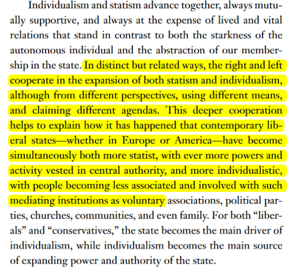 11/ Segundo, el triunfo de los valores liberales. A más individualismo menos vínculos sociales. Cuánto más nos concebimos como elementos aislados, menos razones tenemos para reconocer que nuestro éxito es parte de las instituciones públicas y menos razones para financiarlas.