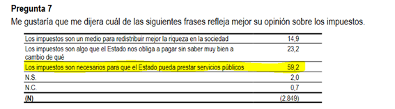 6/ Igualmente, sobre la percepción del uso de los impuestos, una abrumadora mayoría de la población (60%) afirma que los impuestos son necesarios para el funcionamiento correcto de los servicios públicos.