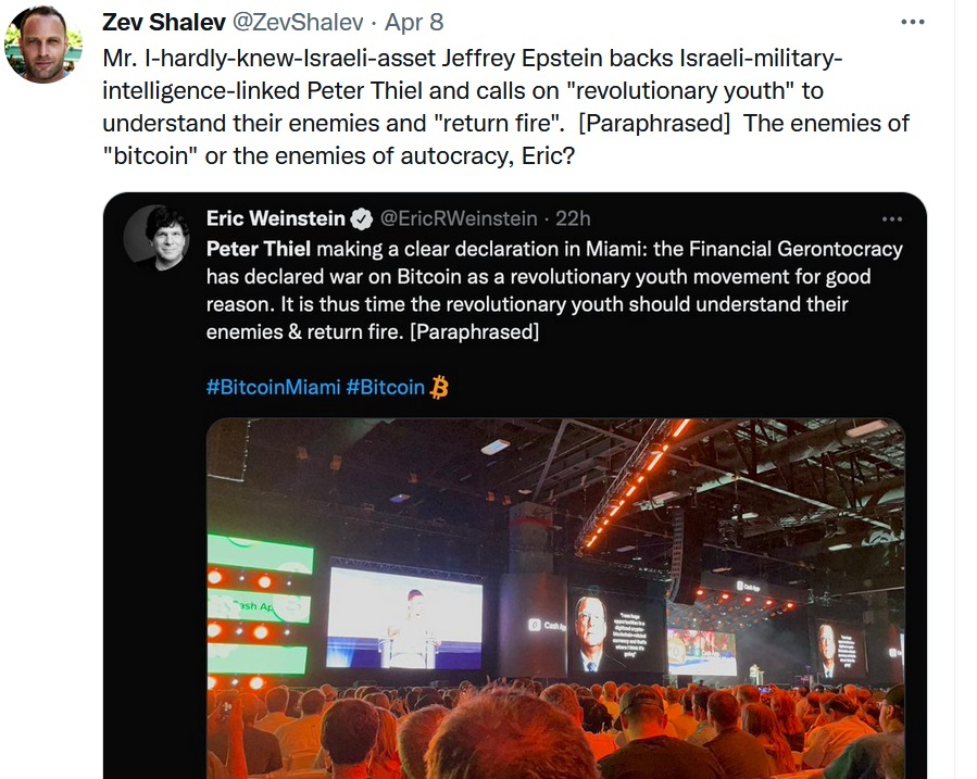Pic 1: Zev Shalev points out Eric Weinstein backing Peter Thiel's push for Bitcoin