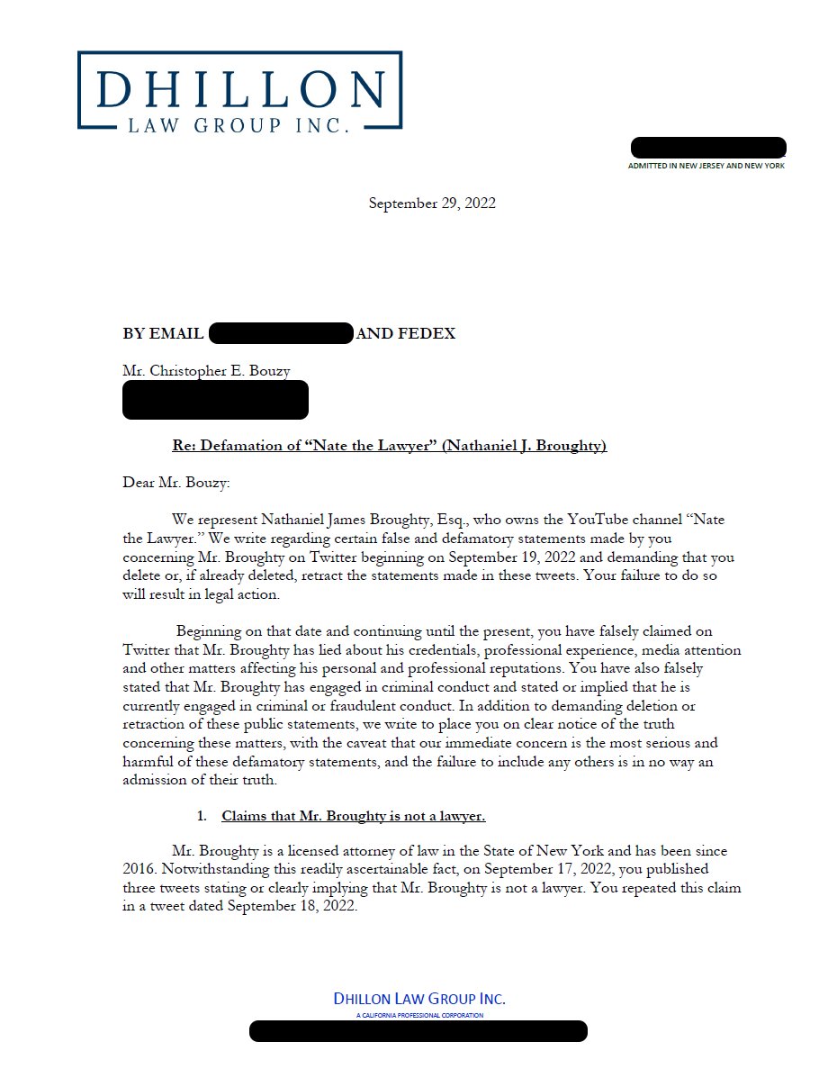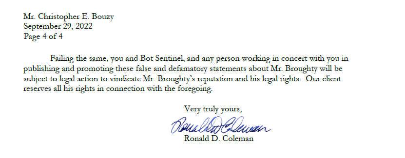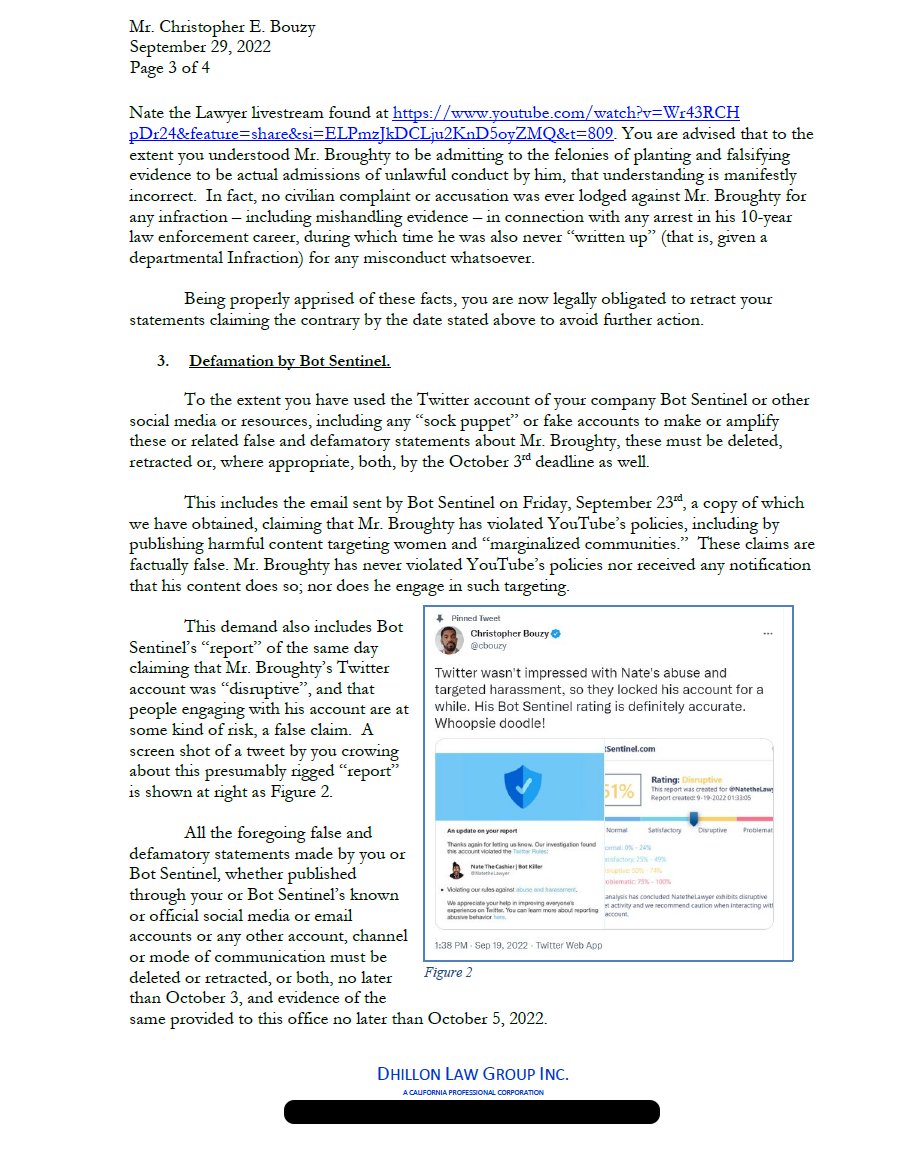 New: I received a demand letter from NateTheLawyer's MAGA lawyer, and it's embarrassing. He is threatening to sue Bot Sentinel and me for comments his client made, deleted tweets, Bot Sentinel rating, and Twitter accounts not linked to me. LawTube lawyers are not serious lawyers.