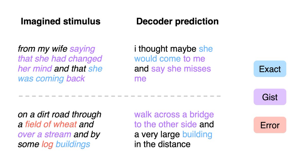 the same decoder also worked on brain responses while subjects imagined telling stories, even though the decoder was only trained on perceived speech data. we expect that training the decoder on some imagined speech data will further improve performance (4/7)