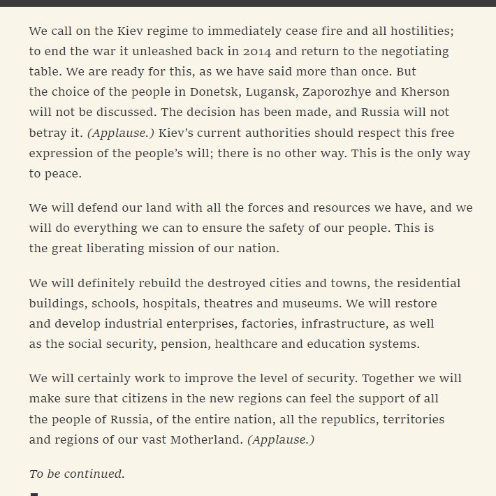 I want the Kiev authorities and their true handlers in the West to hear me now, and I want everyone to remember this: the people living in Lugansk and Donetsk, in Kherson and Zaporozhye have become our citizens, forever.