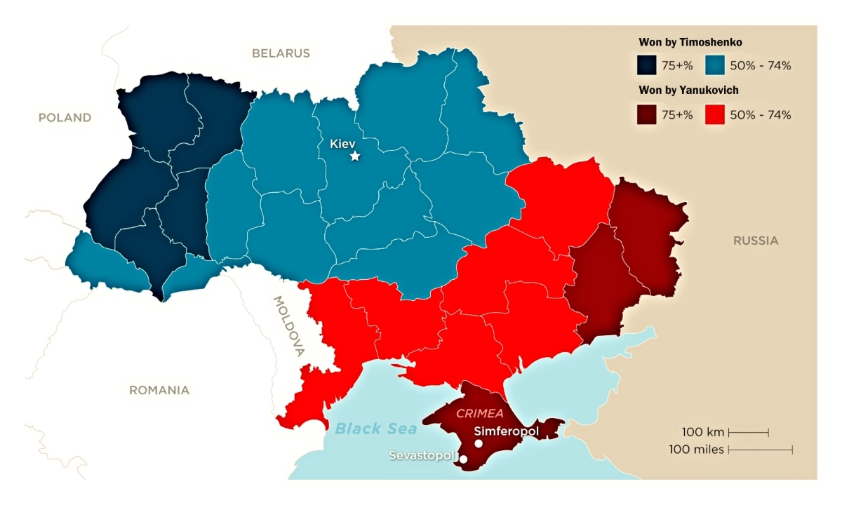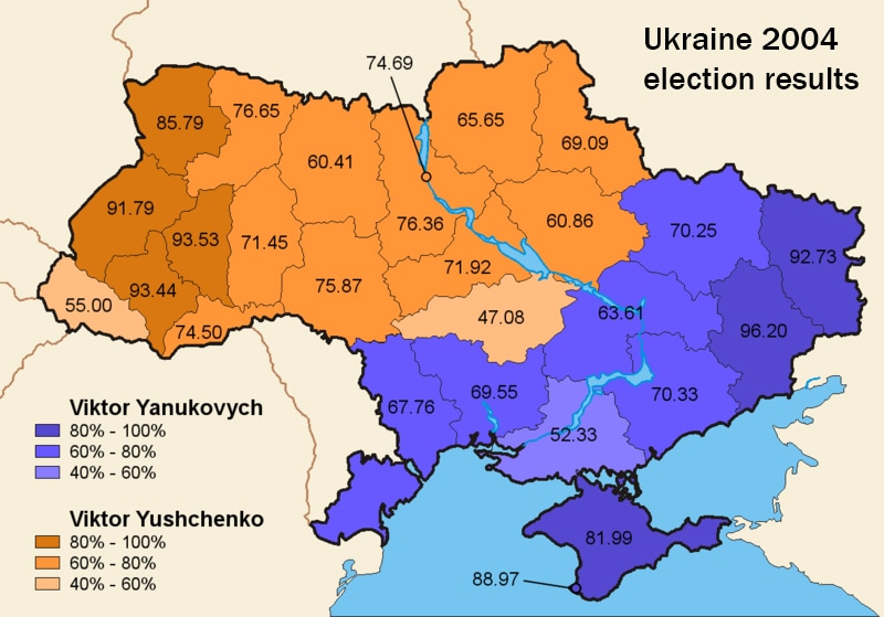 The first image shows the results of the 2004 election in Ukraine by region. The second shows Yanukovych vs. Yushchenko a decade later.