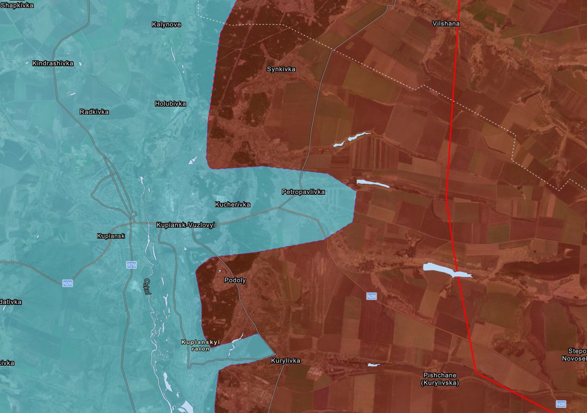 Forces south of Izyum City near Kamianka and Mala Komyshuvakha need to cross the Seversky Donetsk River AND the Oskil Eiver while defending the whole group's southern flank from Ukrainian forces advancing in the Dibrove - Sulyhivka - Dovhenke direction.