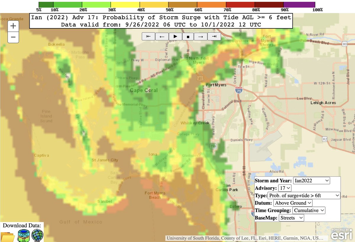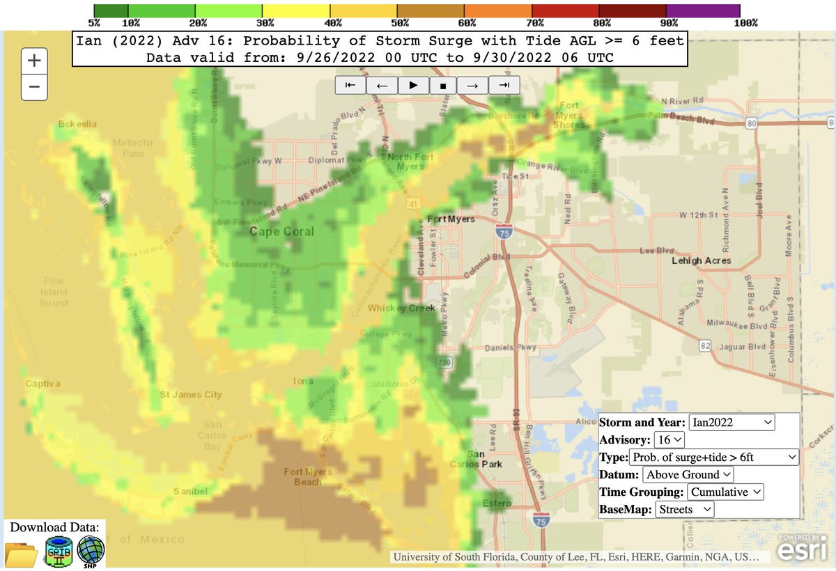 Late on Sunday night, the National Weather Service produced a model showing some alarming numbers: A 40% chance of water 6 feet above ground level in parts of Fort Myers Beach. Many other areas also had 10%+ risk.