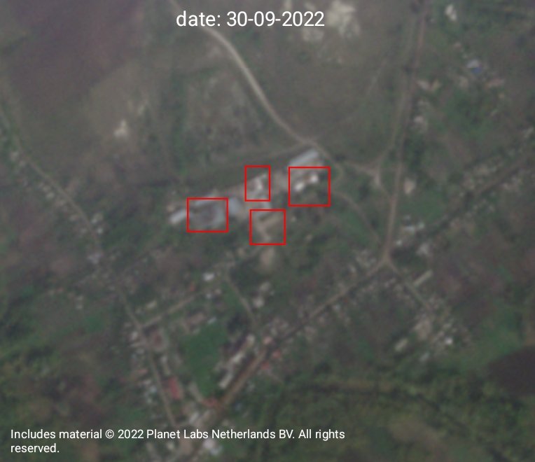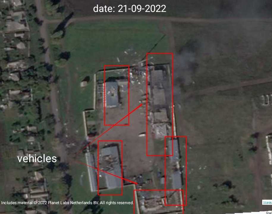 And last but not least we move north of Satove to Nyzhnia Duvanka. Again a large warehouse area Geolocation [49.586562, 38.167782] was hit by at least six projectiles destroying 4 large storage area's. A large number of vehicles can be seen around this area.