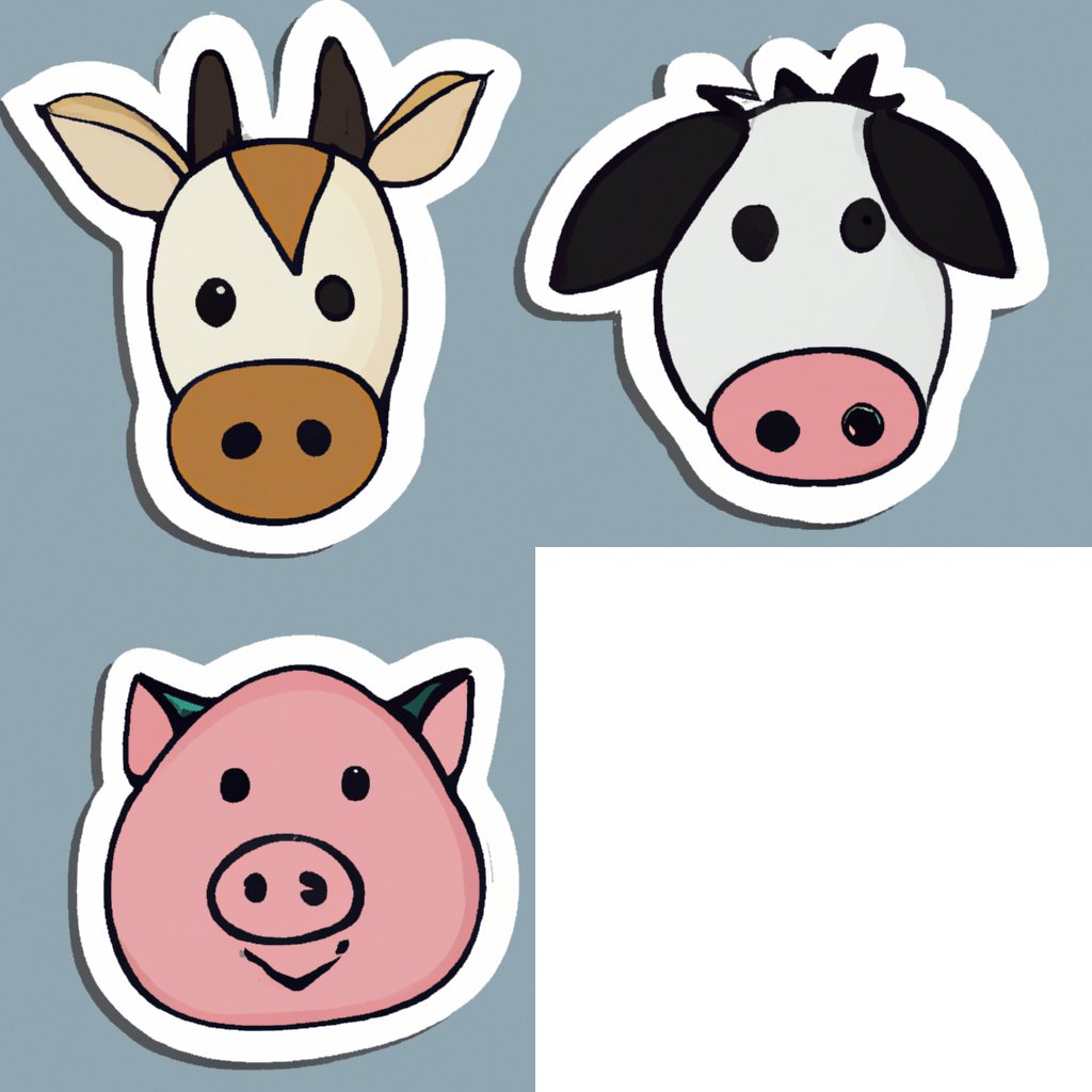 "Four trendy hand illustrated animal stickers: a pig, a duck, a cow and a sheep, vector art"