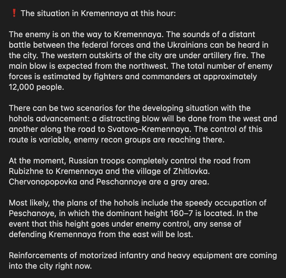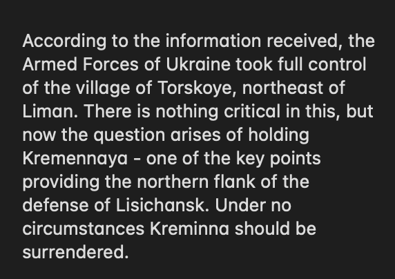 Unclear if the 🇷🇺 regular army actually had time to retreat. Unconfirmed information from 🇷🇺 reporting 2 battalions of mobilized & and a “D/LPR” brigade with regular army leaving Lyman. The supply and retreat routes are under 🇺🇦 fire control.