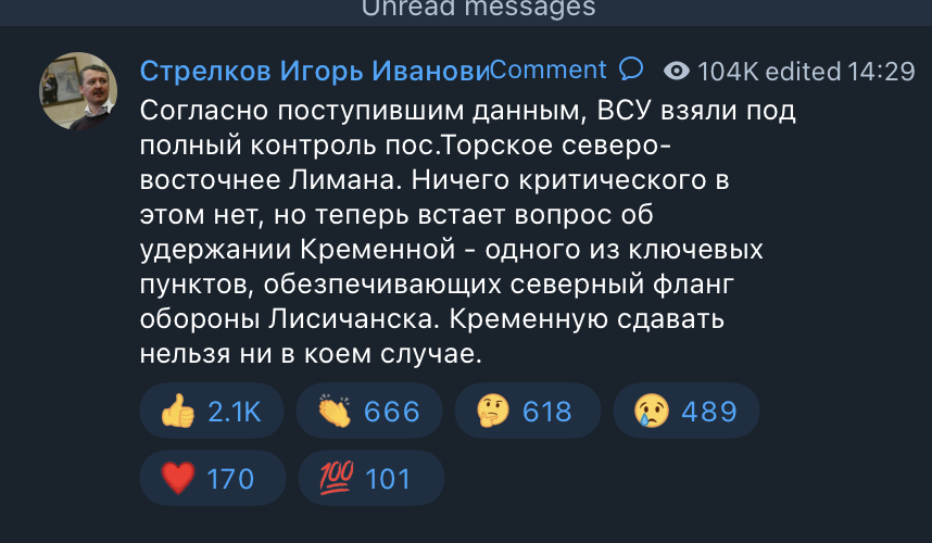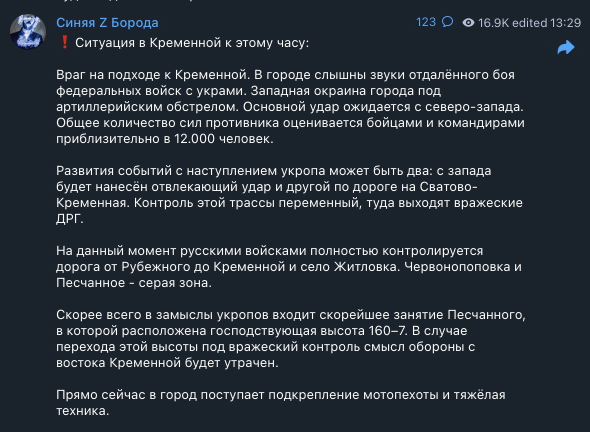 The AF of Ukraine destroyed a lot of the enemy force and took enemy equipment and ammunition. In Zarichne, the reinforcements sent there to defend Lyman are in danger of encirclement. The tragedy of Lyman is entirely Putin’s fault. RU army should have withdrawn two days ago.