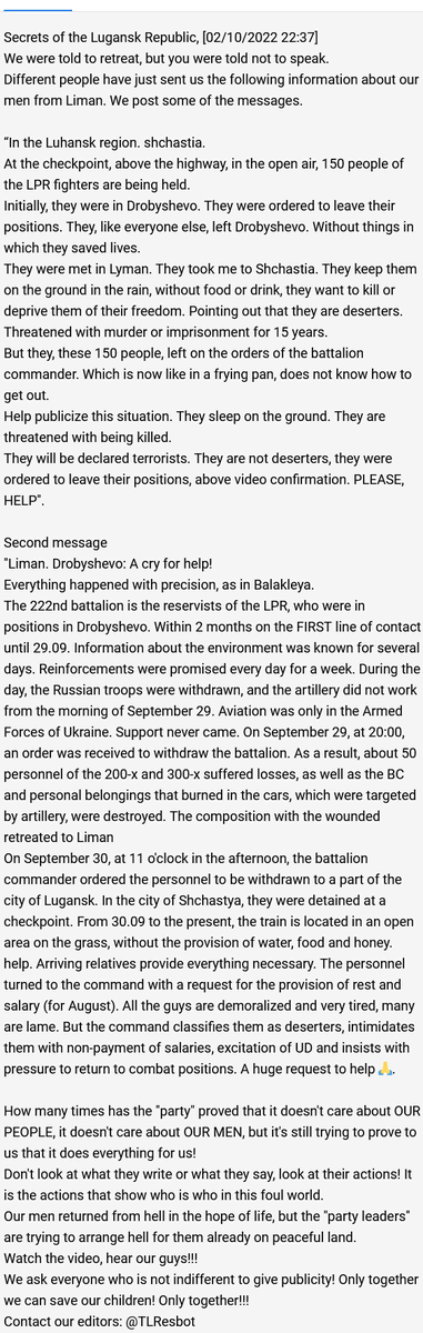 After retreating from Drobyshevo, suffering heavy losses in the process, some LPR forces are being treated as deserters. Auto-translation of some messages in the screenshot, and some videos below. t.me/TLRes/352