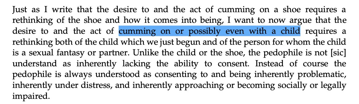 "So just as we must ask the shoe if it wants to be worn, we must enter a place epistemically in which we can ask the child if it wants to have sex. Again, the way in which we ask must not require an answer, or again at least not one which is conventionally intelligible or audible