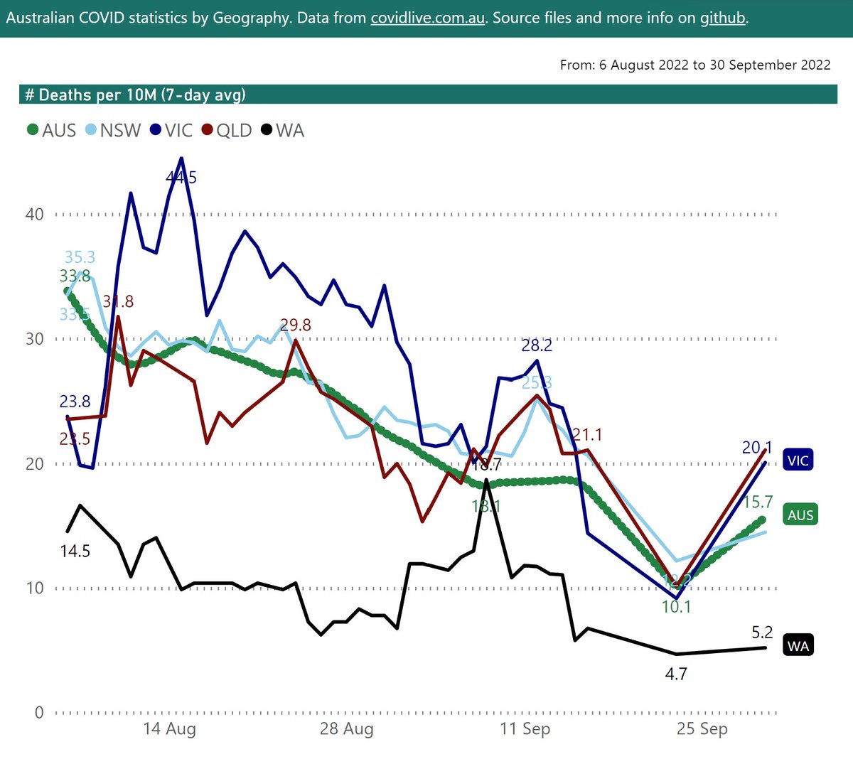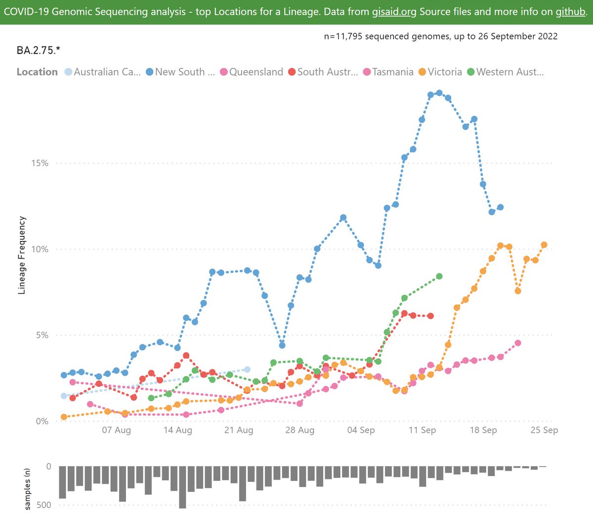 Breaking down Australia by state shows BA.2.75.* "Centaurus" has most frequently been reported in New South Wales, approaching 20% recently. Victoria's recent update took them to 10%.