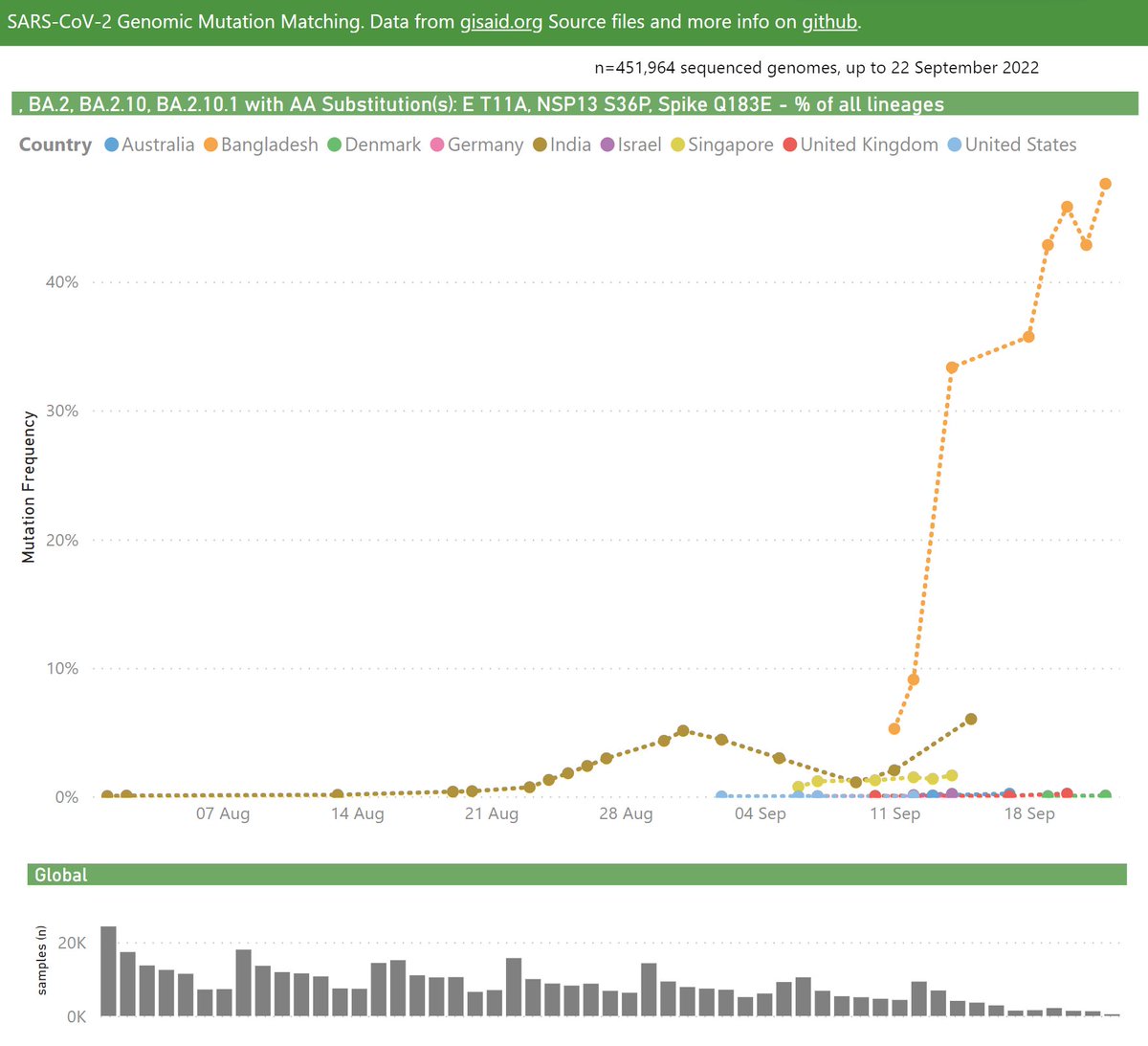The XBB categorisation has yet to rollout to the GISAID database, so I'm approximating it here by searching for samples with the characteristic mutations - Spike Q183E, NSP13 S36P and E T11A (h/t @siamosolocani).