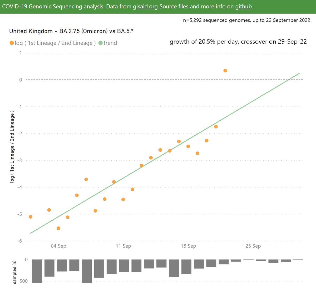 For the UK, BA.2.75 "Centaurus" is showing a growth advantage of 20% per day against BA.5.* lineages, which predicts a crossover in [checks watch] late September.