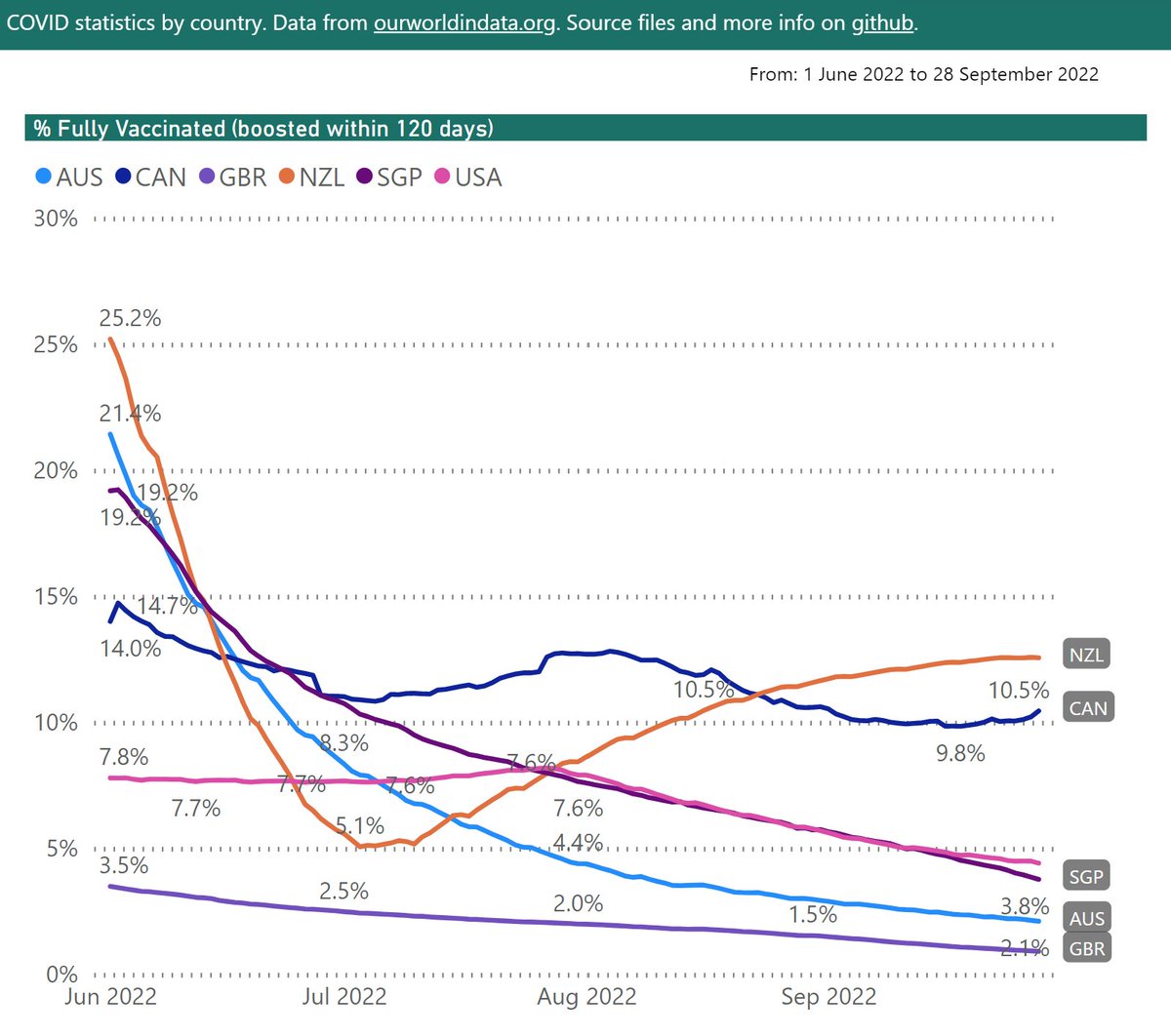 I define "fully vaccinated" as the % who received a booster in the last 120 days - as recommended by US CDC, Australia's ATAGI etc for vulnerable folks.