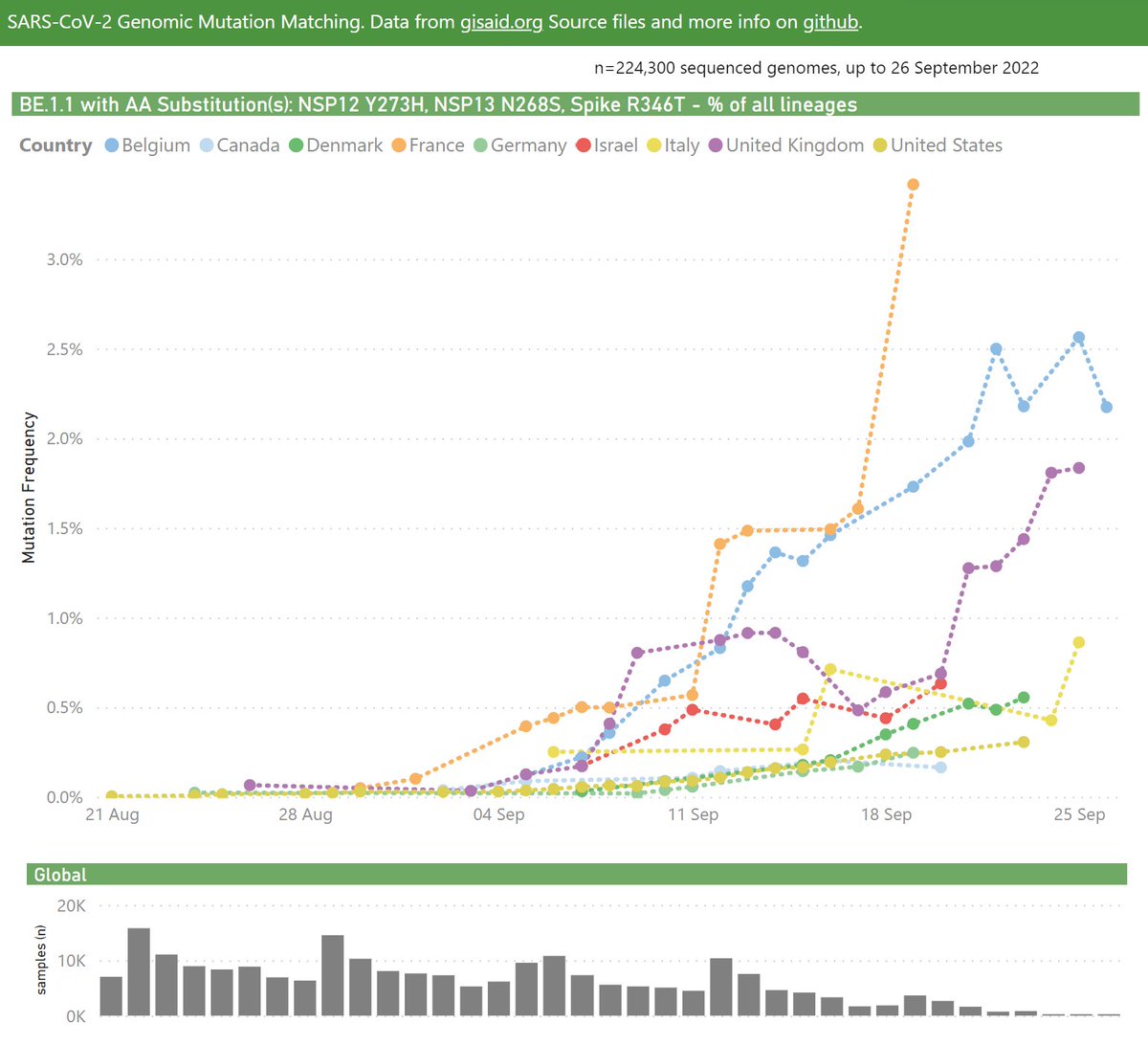 The BQ.1.1 categorisation has yet to rollout to GISAID, so I'm approximating it here by searching for samples of BE.1.1 with the characteristic mutations - NSP12:Y273H, Spike:R346T and NSP13:N268S (h/t @josetteshoenma)
