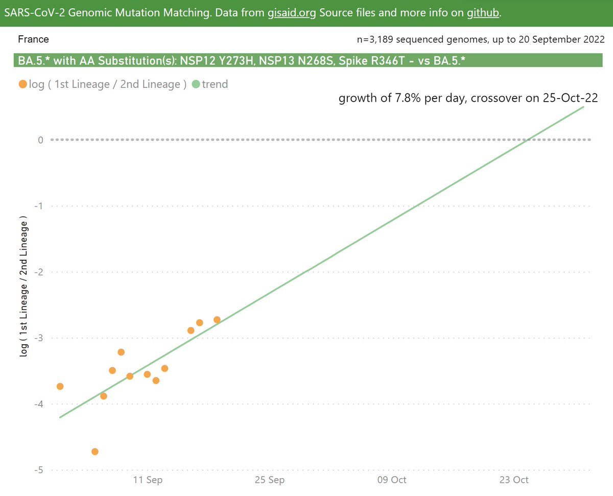 For France, BQ.1.1 is showing a growth advantage of 8% per day against all other BA.5.* lineages, which predicts a crossover in late October.