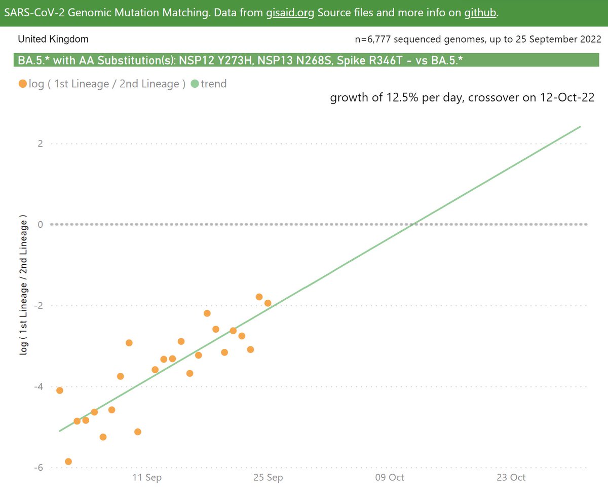 For the UK, BQ.1.1 is showing a growth advantage of 12% per day against all other BA.5.* lineages, which predicts a crossover in mid-October.