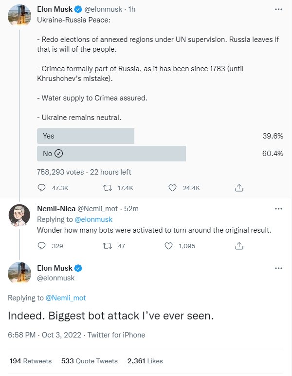 15/ Bonus: Mr Musk is now questioning the election integrity of his own twitter poll, which I note wasn't even conducted at Russian gunpoint.