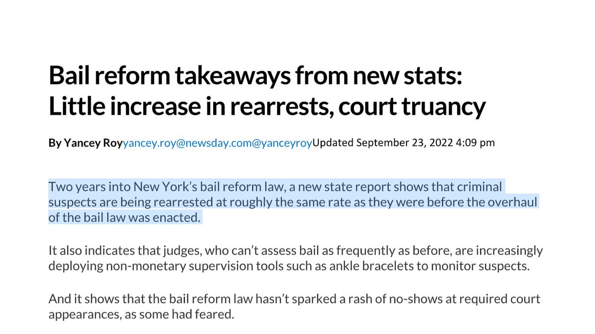 Newsday leaves no room for bullshit. No change in rearrest rates before/after: "Two years into New York’s bail reform law, a new state report shows that criminal suspects are being rearrested at roughly the same rate as they were before the overhaul of the bail law was enacted."