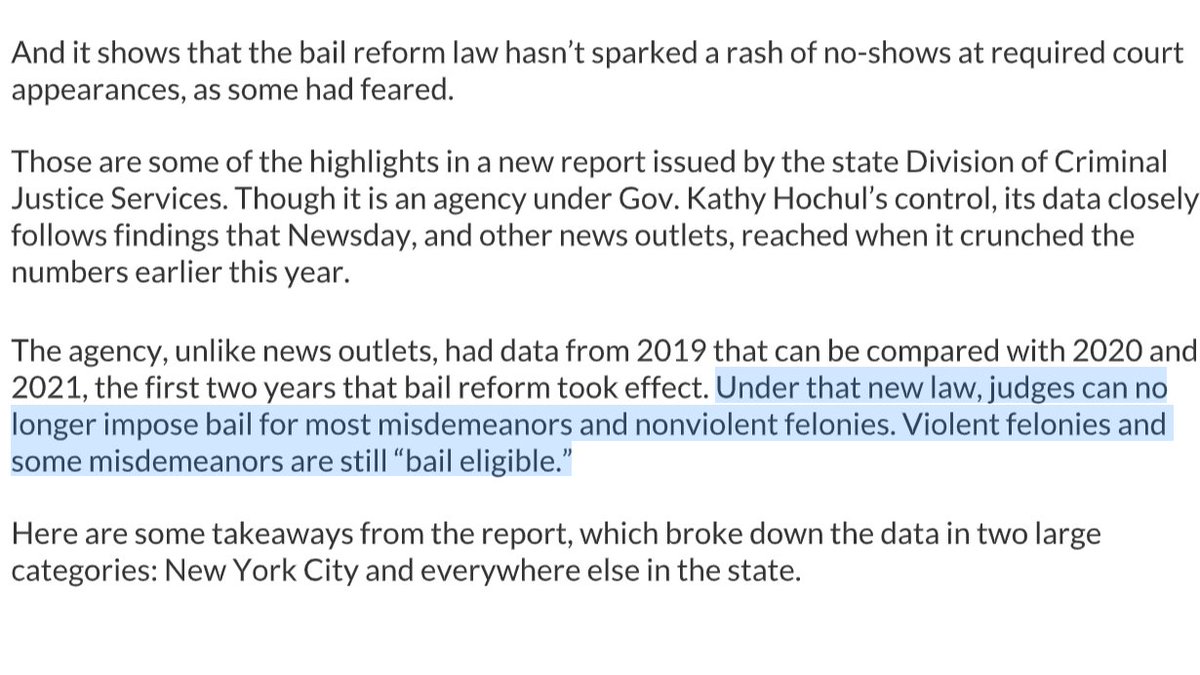 Newsday states clearly the modest nature of bail reform. "Under that new law, judges can no longer impose bail for most misdemeanors and nonviolent felonies. Violent felonies and some misdemeanors are still 'bail eligible.'" No room for lies from police about "violent suspects."