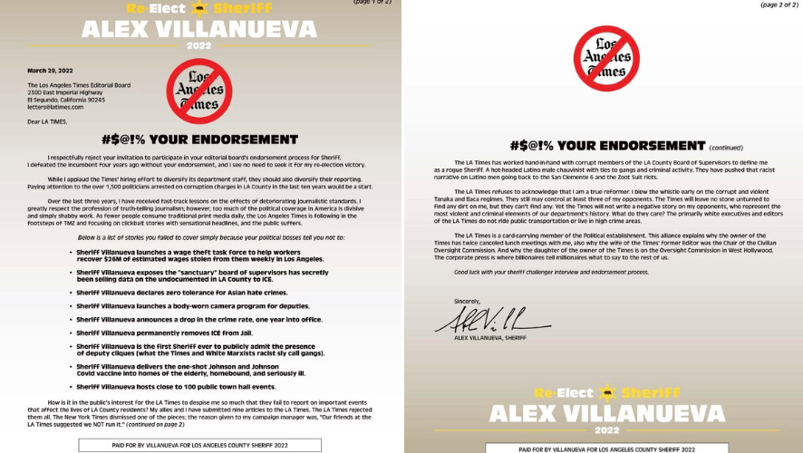What's disturbing is Politico's attack on a local activist for rightfully criticizing harmful journalism, while the emboldened LA County Sheriff, not only attacks political opponents, but runs campaign ads against the LA Times. Like this one: "FUCK your endorsement"