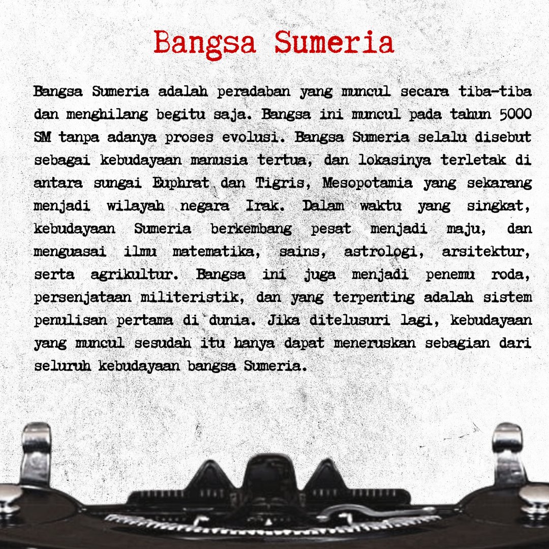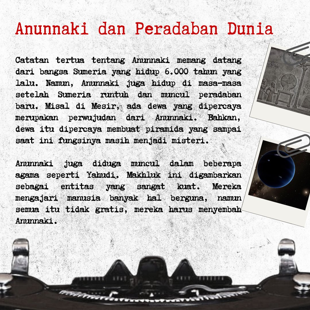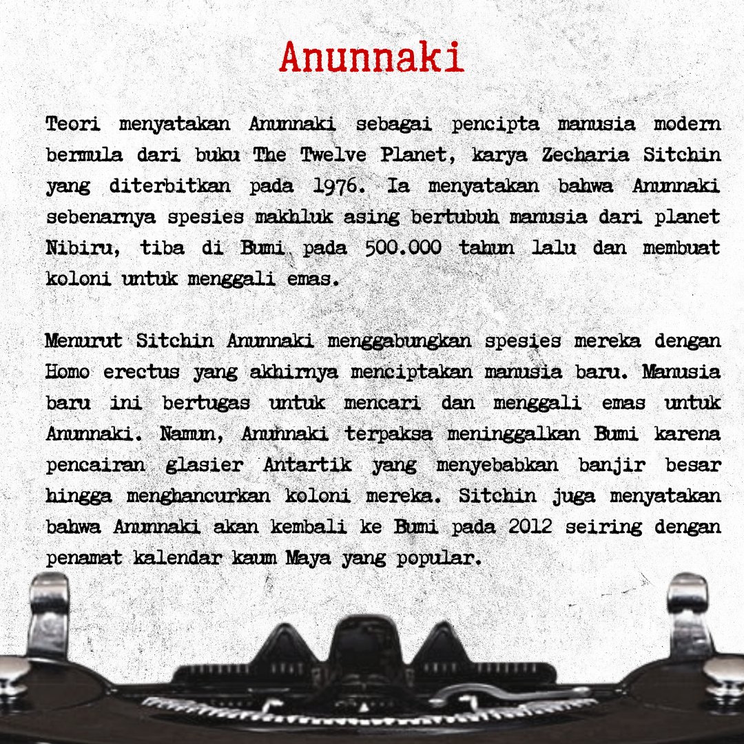 Teorinya Piramida Mesir aja dibuat oleh keturunan Anunnaki. Ada cerita tentang banjir bandang juga dll.