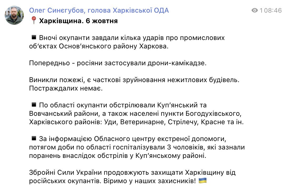 ⚡️Oleh Syniehubov: The occupiers shelled Kupiansk and Vovchansk districts in the region, as well as settlements in Bohodukhiv and Kharkiv districts: Udy, Veterynarne, Strilecha, Krasne, etc.