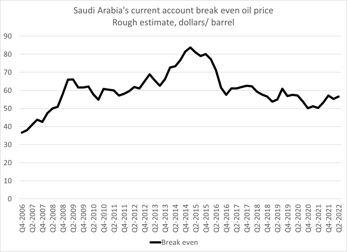 Saudi production and oil export by volume numbers aren't released quickly, so calculating the Saudi break even (the price that balances the current account) takes a bit of guess work. But it is clearly well below the current oil price.