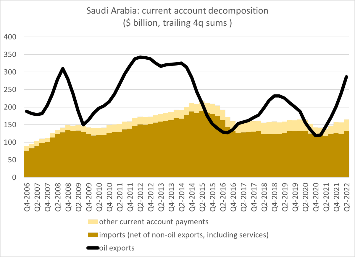 The Saudi break even has been pretty constant since 2008, apart from a brief spending spree from 2012 to 2014. I assume that the Crown Prince's big ambitions (Neom, etc) will raise imports over time, but it hasn't really happened yet.