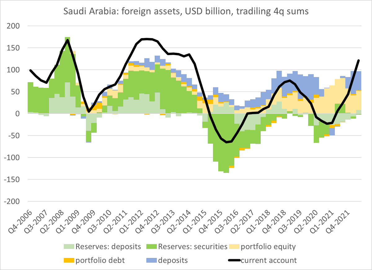 What has happened is a big shift in how the external surplus that the Saudis appear intent on maintaining through production cuts is managed -- it no longer primarily goes into reserves. As @jnordvig has noted, the Saudis now primarily buy equities.