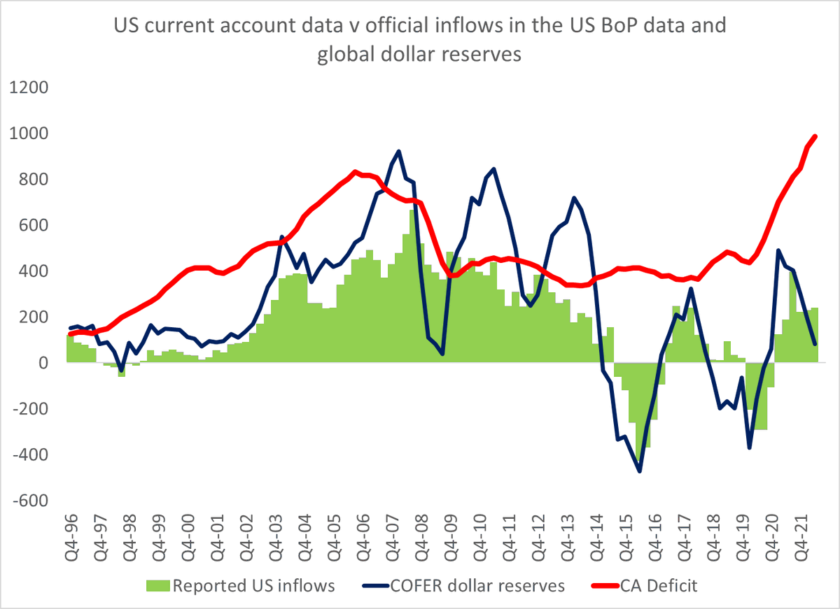 As a description of the past, the fall in headline reserves is a bit misleading. Falls in the value of US Treasuries easily could account for $400b of the drop in headline reserves (through q2), falls in the EUR, GBP and JPY could explain another $500b (through q3)