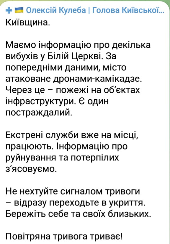 The head of the regional administration of Kyiv Oblast confirms that the city of Bila Tserkva was attacked with loitering munitions tonight; fires broke out at "infrastructure objects" as a result.