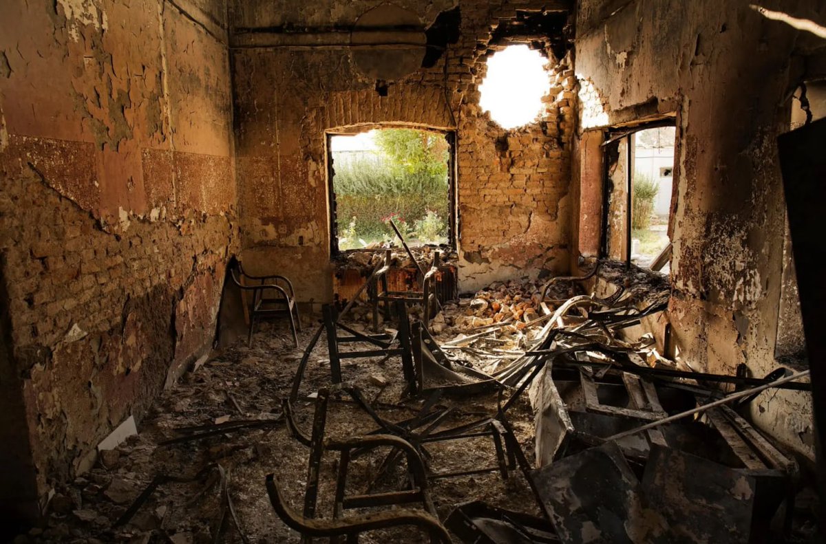 A heap of scrap metal, beams, concrete, debris, chairs, remains of bodies, Scattered pieces of newspapers and documents, burnt cars were on the ground.