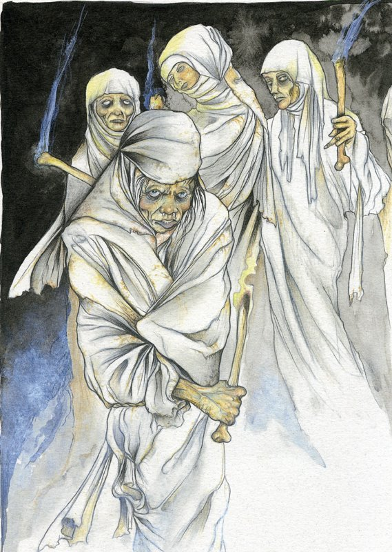 Estos personajes cumplían la función de psicopompos, es decir, de guiar a los difuntos hacia el Más allá. El ejército furioso de Wotan/Odín era el encargado de recoger las almas de los caídos en combate y guiarlas hasta la otra vida... ¿os suena?