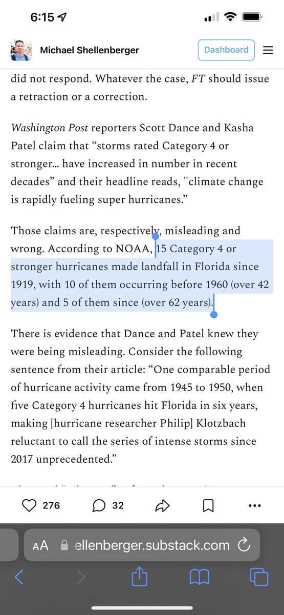 The NY Times says climate change is “making storms like Hurricane Ian more destructive,” but that’s false: there have been 15 Category 4, or stronger, landfalling hurricanes in Florida since 1919. Ten occurred before 1960 and just 5 since, according to U.S. govt agency NOAA.
