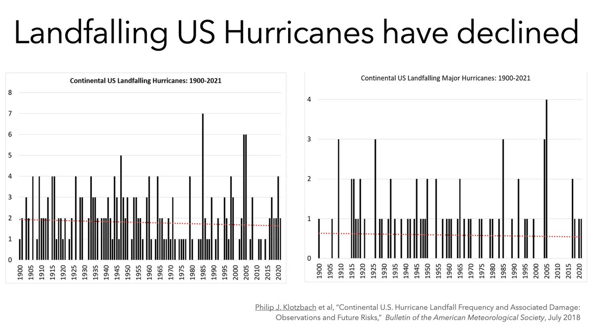 The number of landfalling hurricanes has not increased and neither has the number of major (category 3,4,5) hurricanes. In fact, they've slightly declined. We pay attention to *landfalling* hurricanes because we could not reliably count non-landfalling hurricanes in the past.