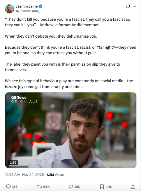 La phrase que vous voyez un peu partout en ce moment: "Ils ne vous tuent pas parce que vous êtes fasciste (ou "nazi"). Ils vous traitent de fasciste (ou "nazi") pour vous tuer" vient d'un "docu" à charge diffusé par la chaîne d'extrême-droite GB News ou ils interviewent "Andrew"