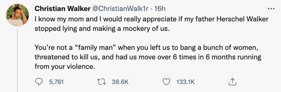 @thedailybeast@HerschelWalker 2. In a tweet, Christian also said that his father, Herschel Walker, threatened to kill him and his mother, Cindy Grossman.