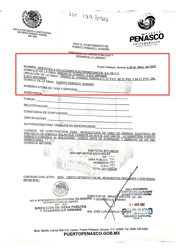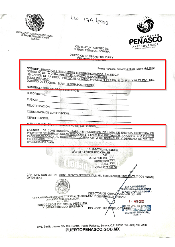 La licencia de Construcción del ayuntamiento de Puerto Peñasco expedida a nombre de "Servicios & Soluciones Electromecánicos S.A. de C.V.", "SESELEC" confirma que la obra se construye en el Predio "El Chamizo", Parcela (1 Z1 P1/1) del Ejido de Miramar.