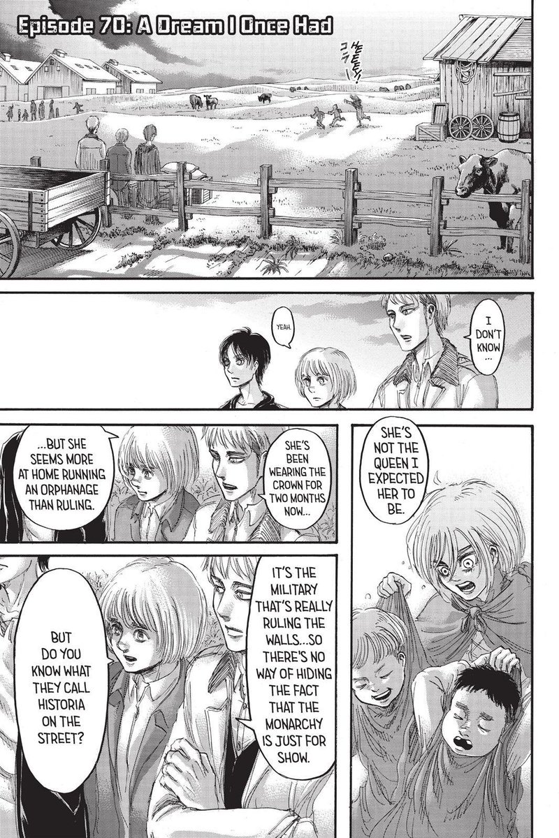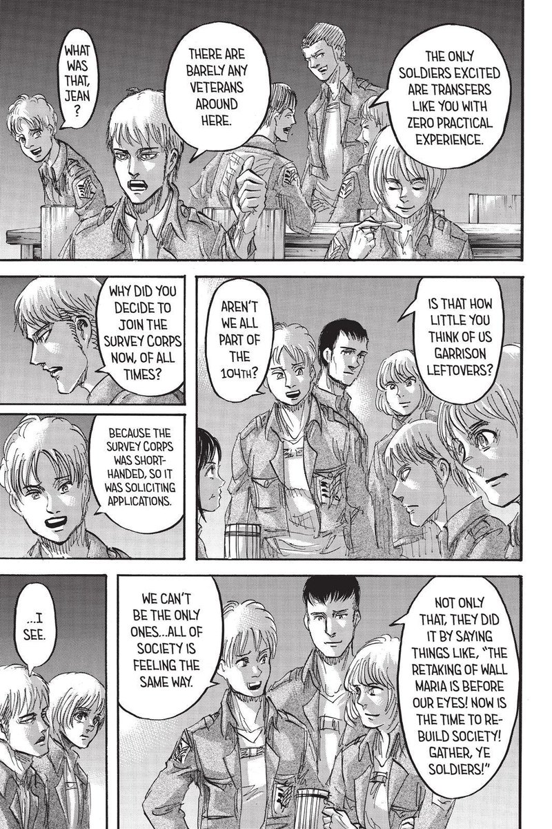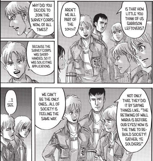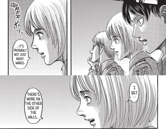 The manga also slightly goes into the process of the gang slowly coming to the realization that the Titans were more than some infected zombies or cursed by nightmares, as Armin notes that there is more to the world beyond the walls #AoTVincent