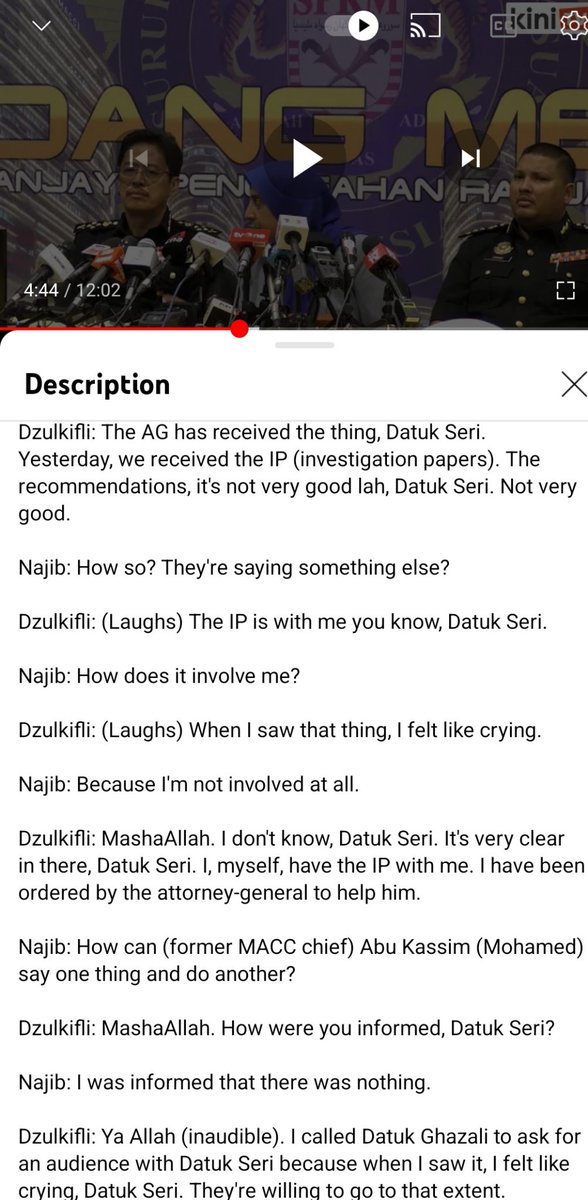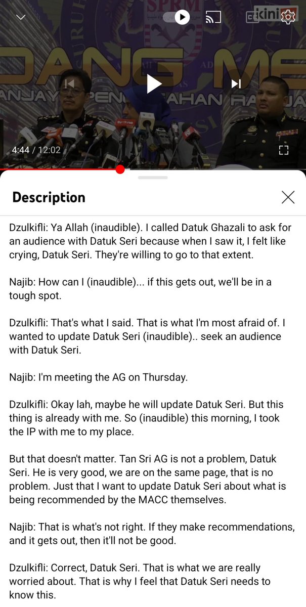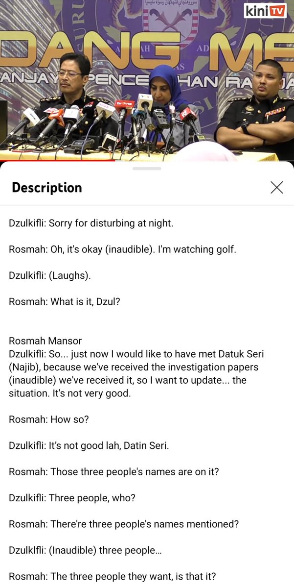 The transcript of Dzulkifli Ahmad's conversation with Rosmah and later Najib on 5 January 2016. Rosmah was watching golf then. Rosmah only wanted three names in IP but Abu Kassim still included Najib. Najib shocked his name was still there despite telling Abu Kassim.